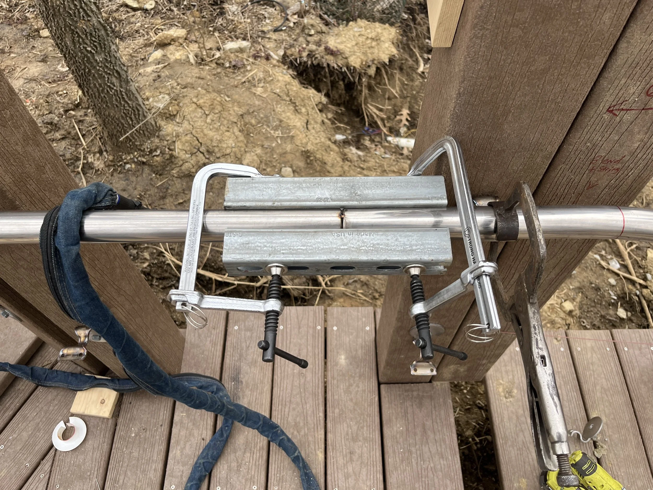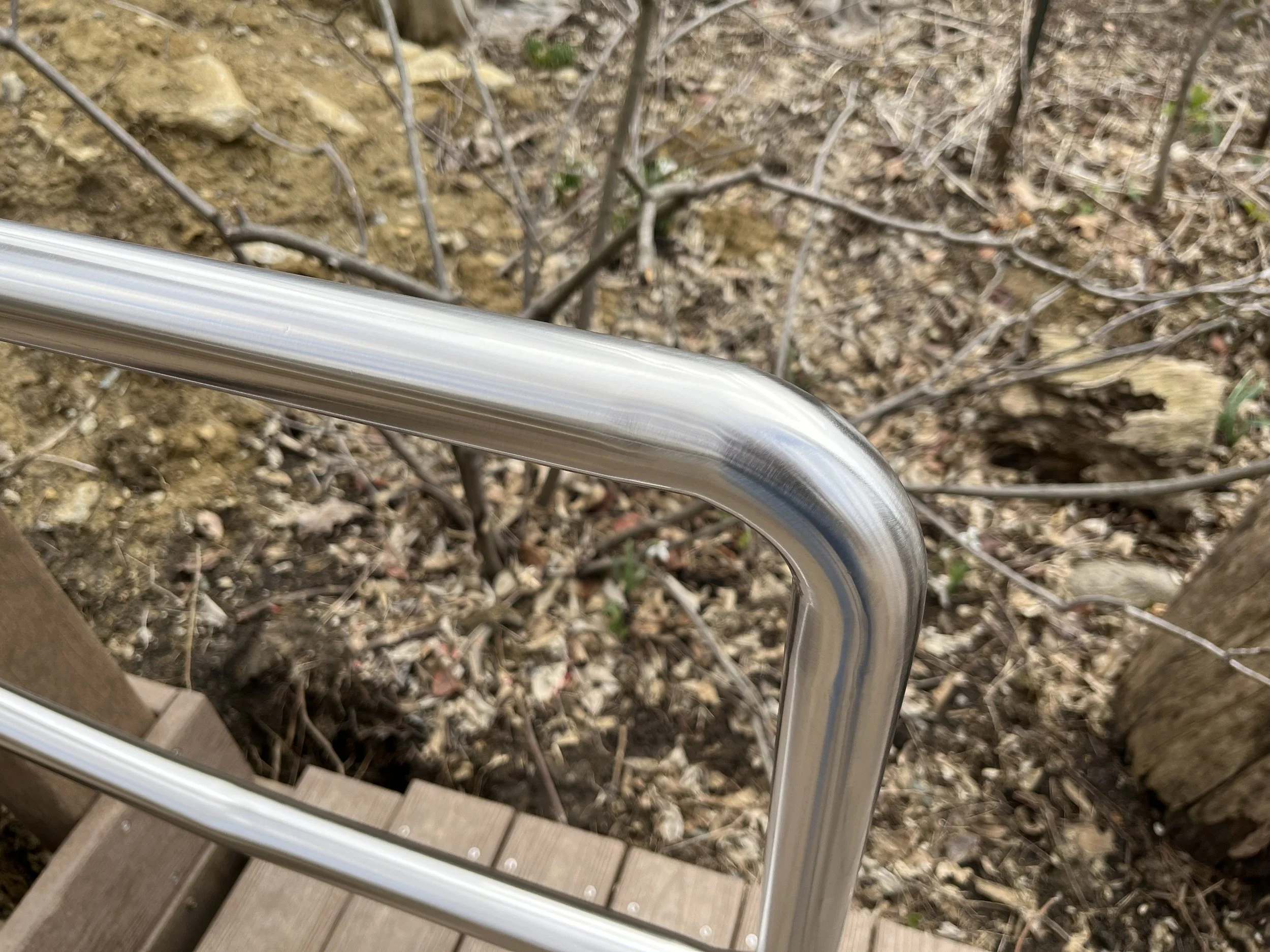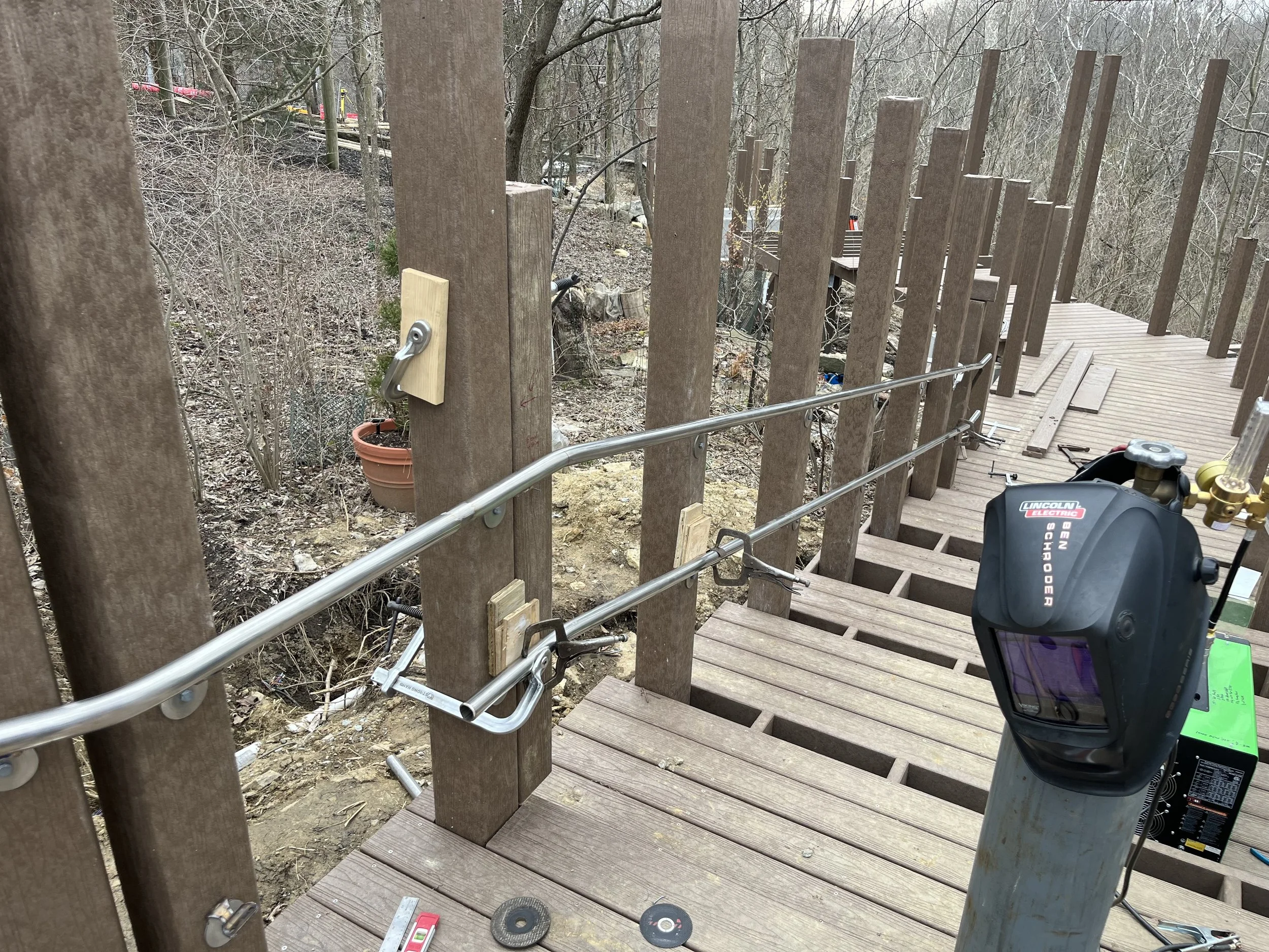 Each of the 4 railing sections are about 38 feet long and made of two 20 foot sections of stainless tubing. With the exception of the detail work on the ends and the hoops at the bottom, there is only 1 splice point in each railing section where the two 20 foot tubes are joined. The 2 pictures above show the 4 points where I welded the tubes together (after some cleanup and polishing of course) . I made all of the bends with a pipe bender with the exception of the 90 degree fittings welded on the detail work and on the hoops at the bottom. This was a fun project! I had never done a handrail like this so it took a while to get it figured out but I was able to do it all without wasting a single piece of the stainless tubing!