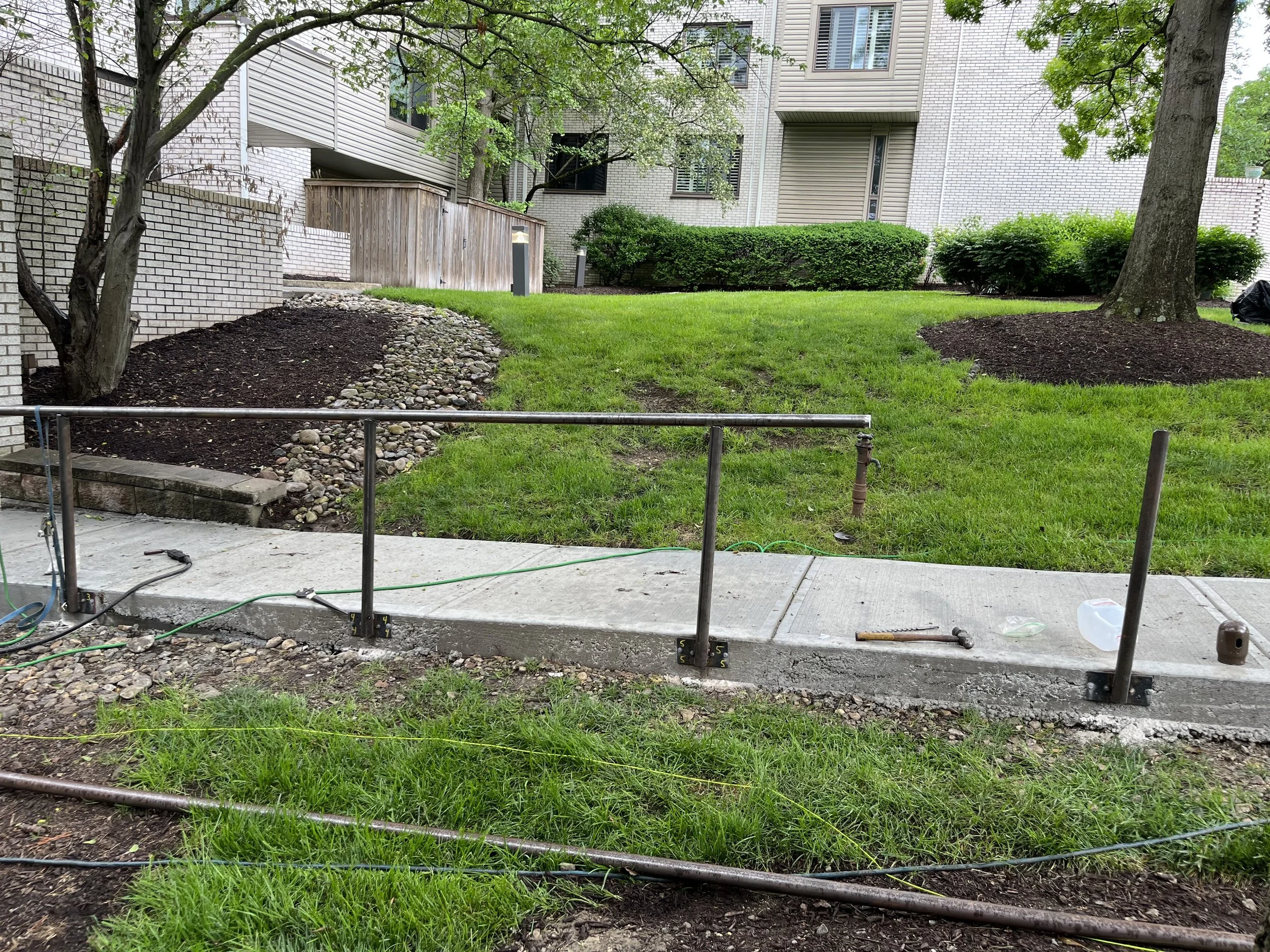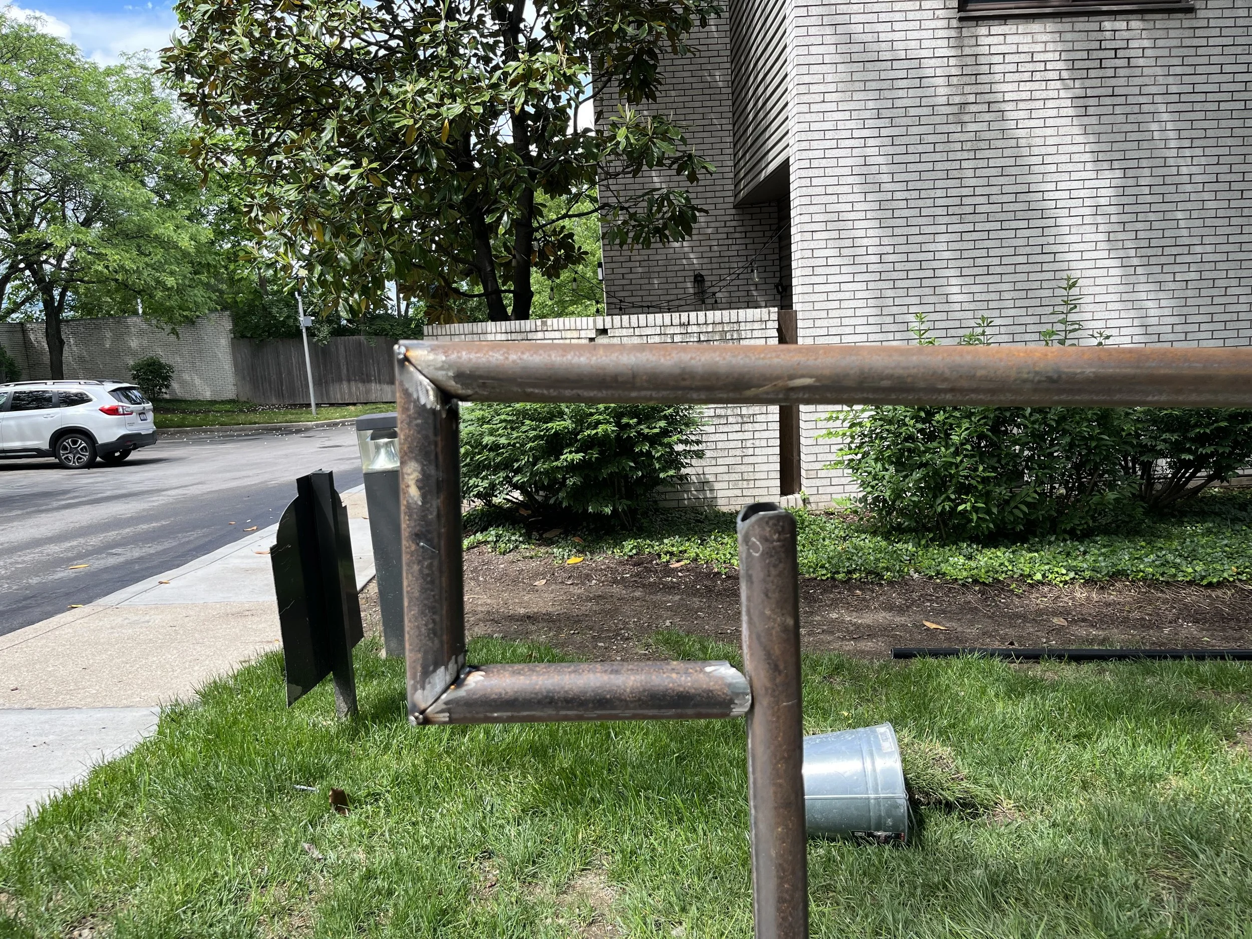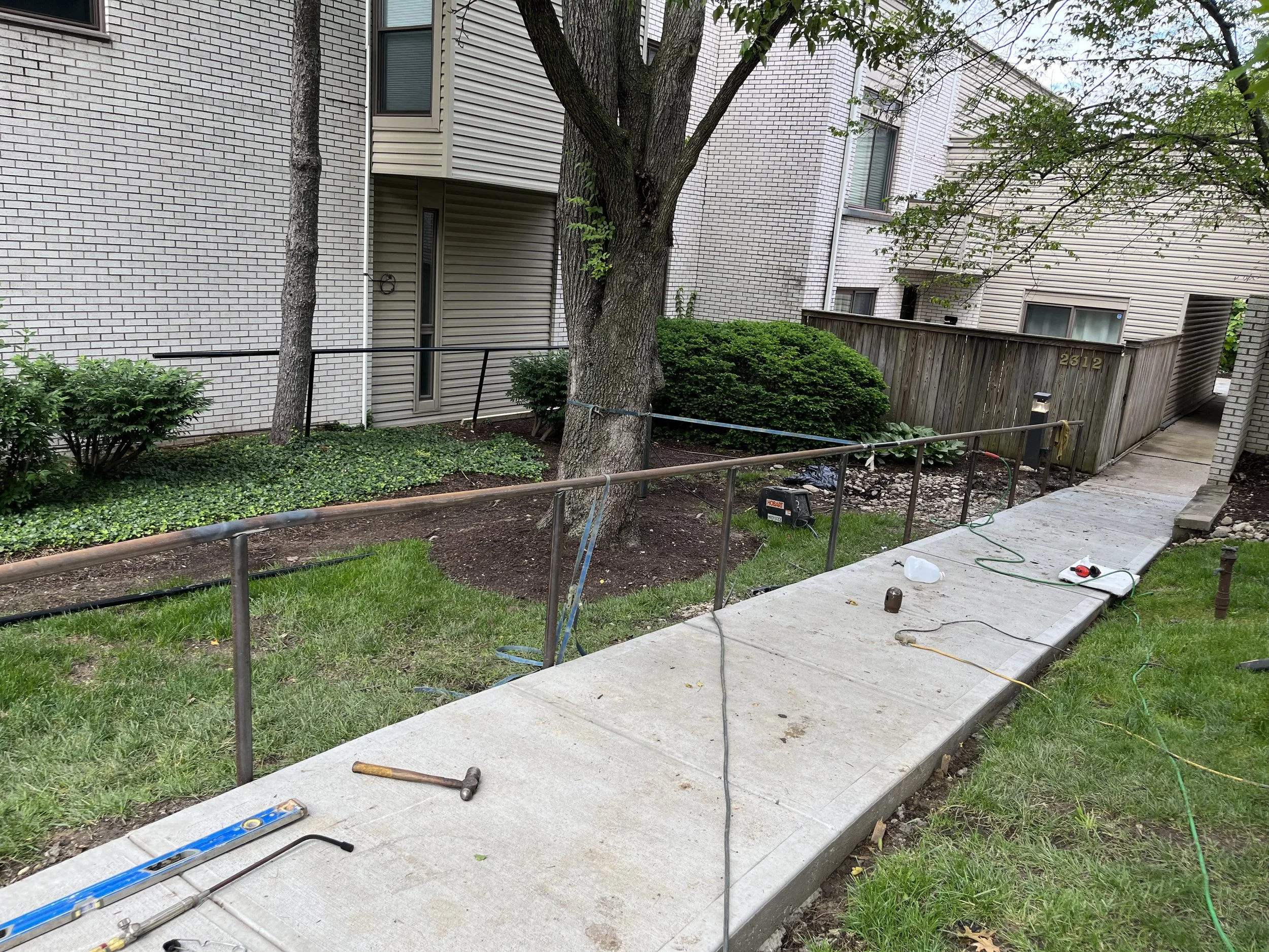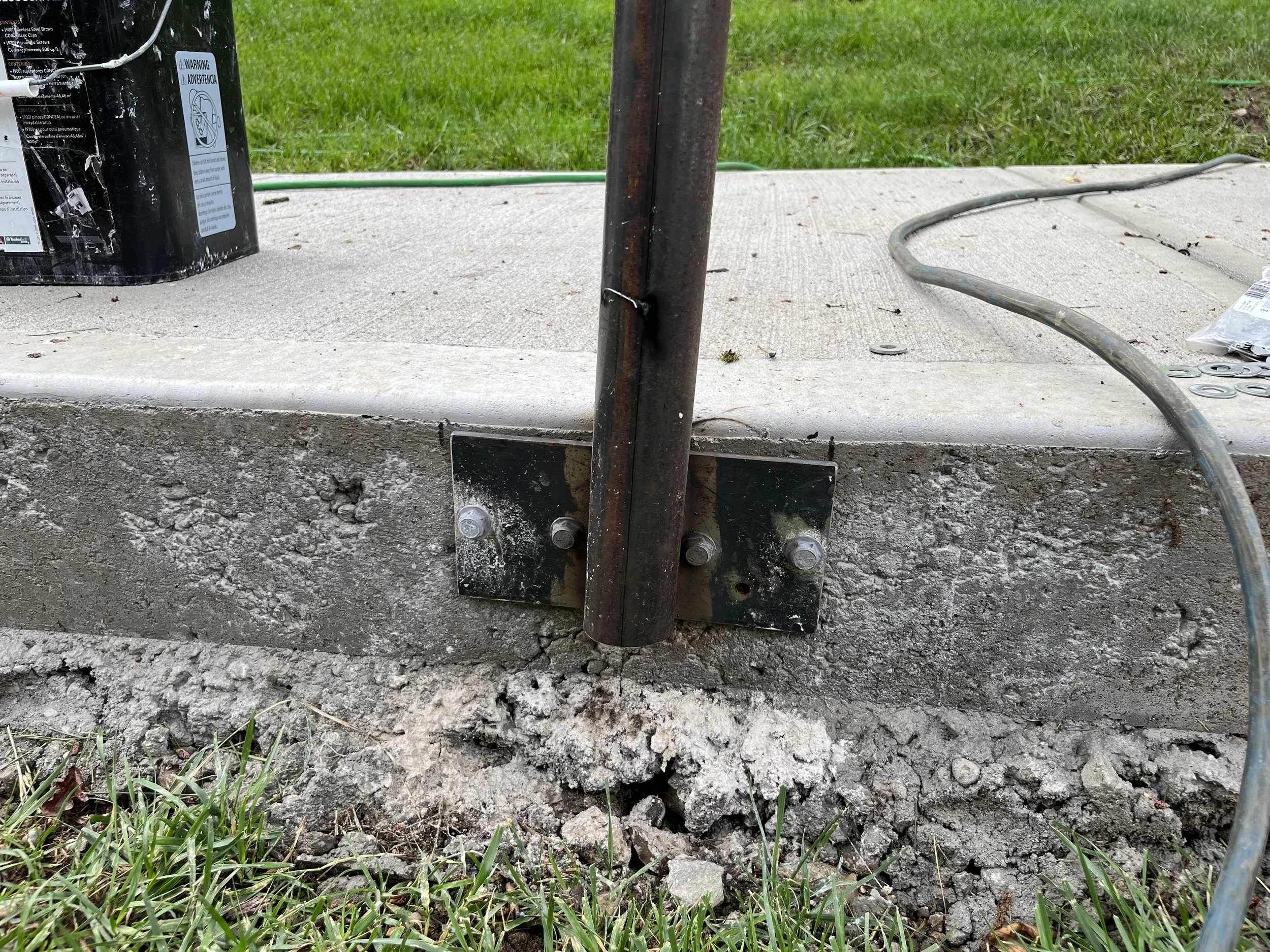 I started by cutting out and drilling all the mounting plates and posts in the shop. The top of the concrete is on a slope and the side of the concrete is not plumb or consistent. After numbering and temporarily mounting the plates I marked a plumb line and used a level on the side of each one to see what direction it was leaning. After taking the plates back off I tacked each post to the top or bottom of the corresponding plate depending on which way the plate was leaning when it was bolted to the concrete. This allowed me to bend Them around during final installation to make them perfectly plumb before fully welding them to the mounting plates.