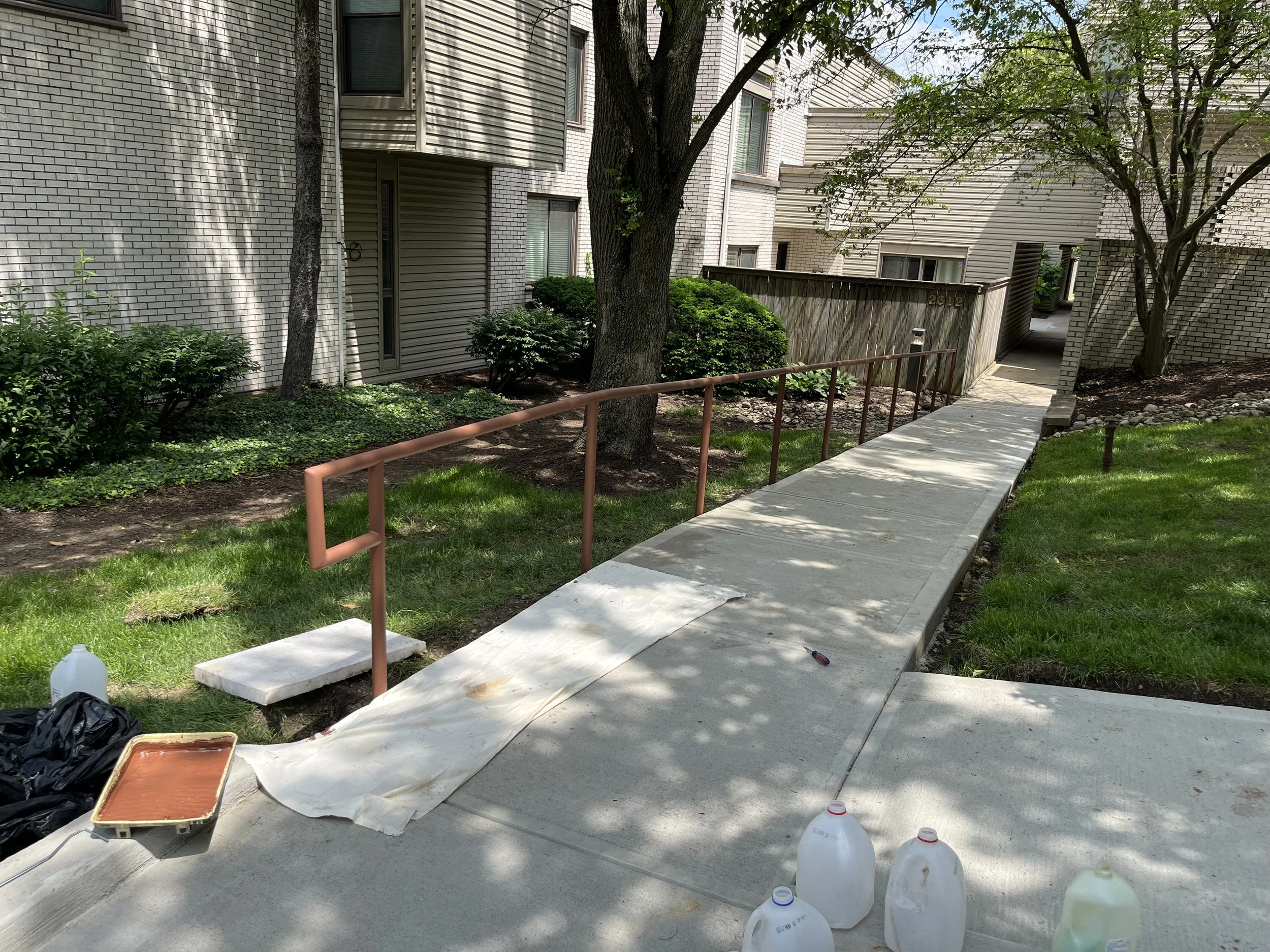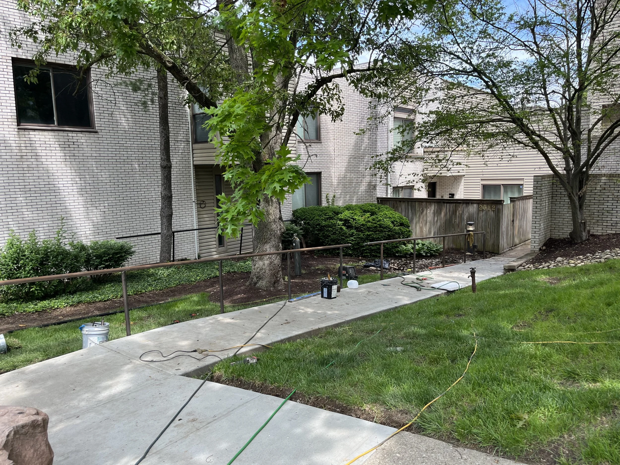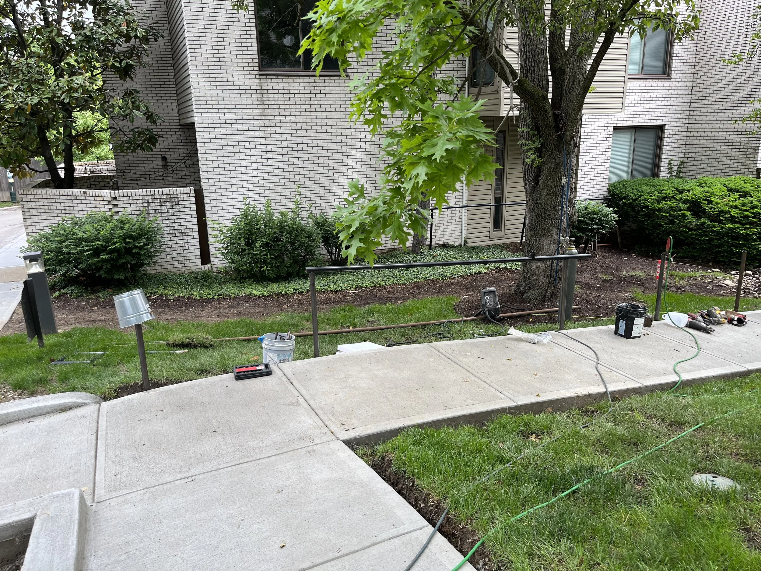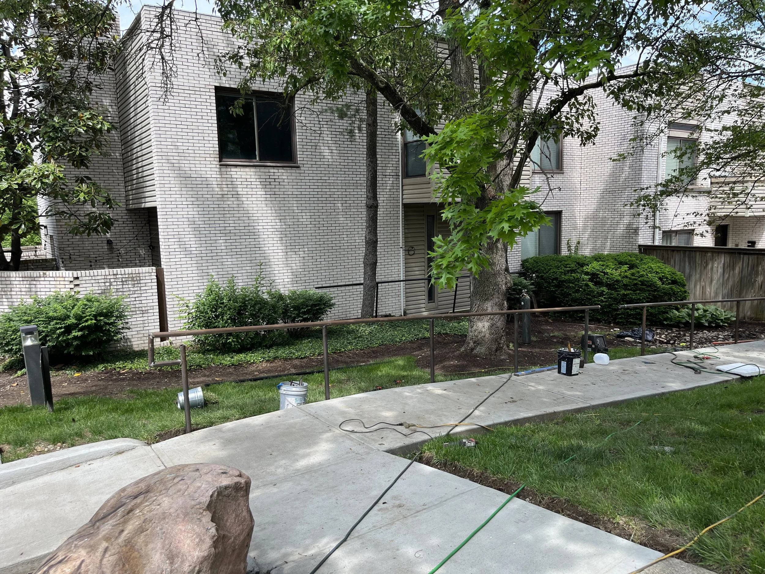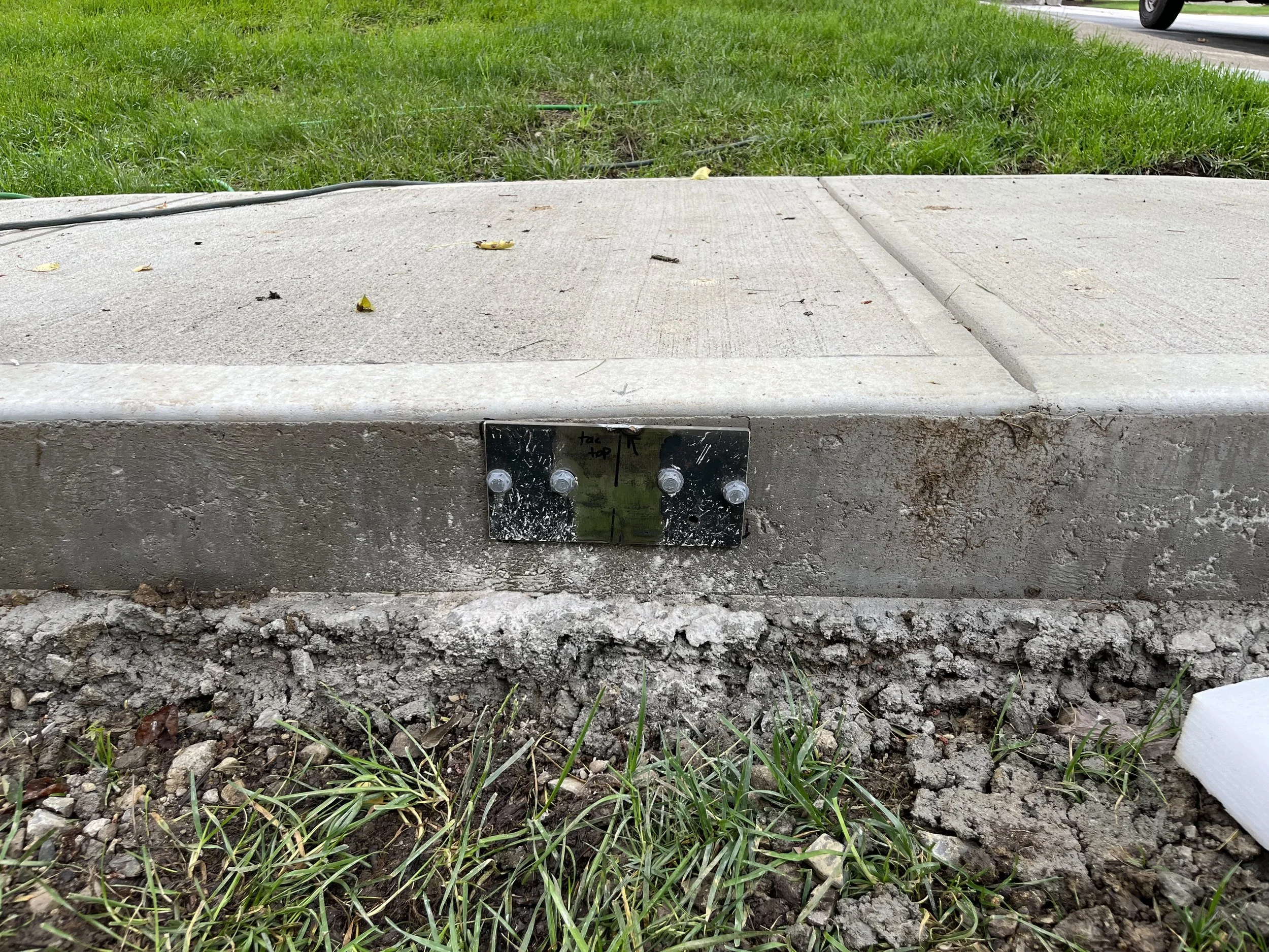 I started by cutting out and drilling all the mounting plates and posts in the shop. The top of the concrete is on a slope and the side of the concrete is not plumb or consistent. After numbering and temporarily mounting the plates I marked a plumb line and used a level on the side of each one to see what direction it was leaning. After taking the plates back off I tacked each post to the top or bottom of the corresponding plate depending on which way the plate was leaning when it was bolted to the concrete. This allowed me to bend Them around during final installation to make them perfectly plumb before fully welding them to the mounting plates.
